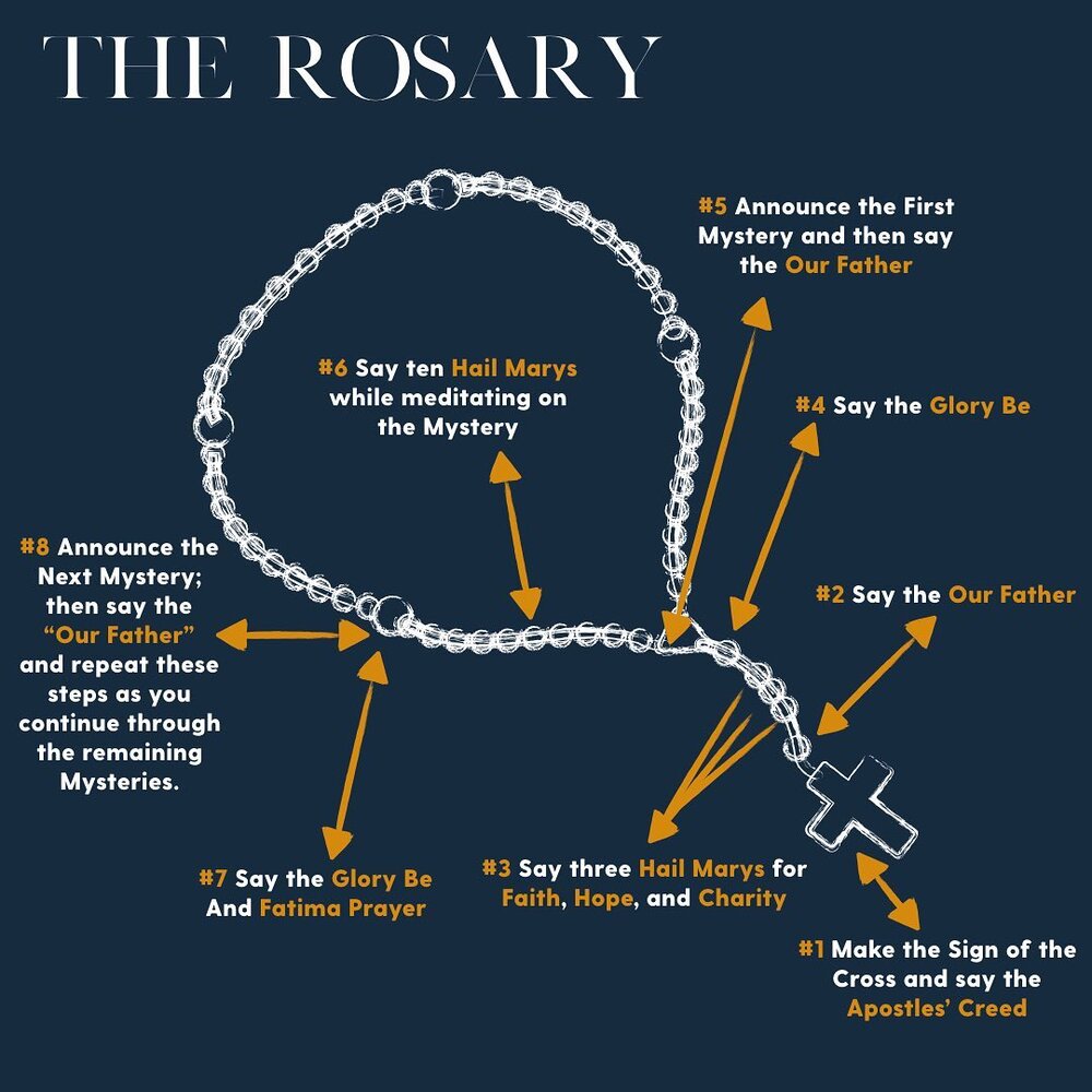 As we start, we hold the rosary and begin with the sign of the cross (#1 below), which orients our heart to the universal and ecclesial nature of the Rosary.