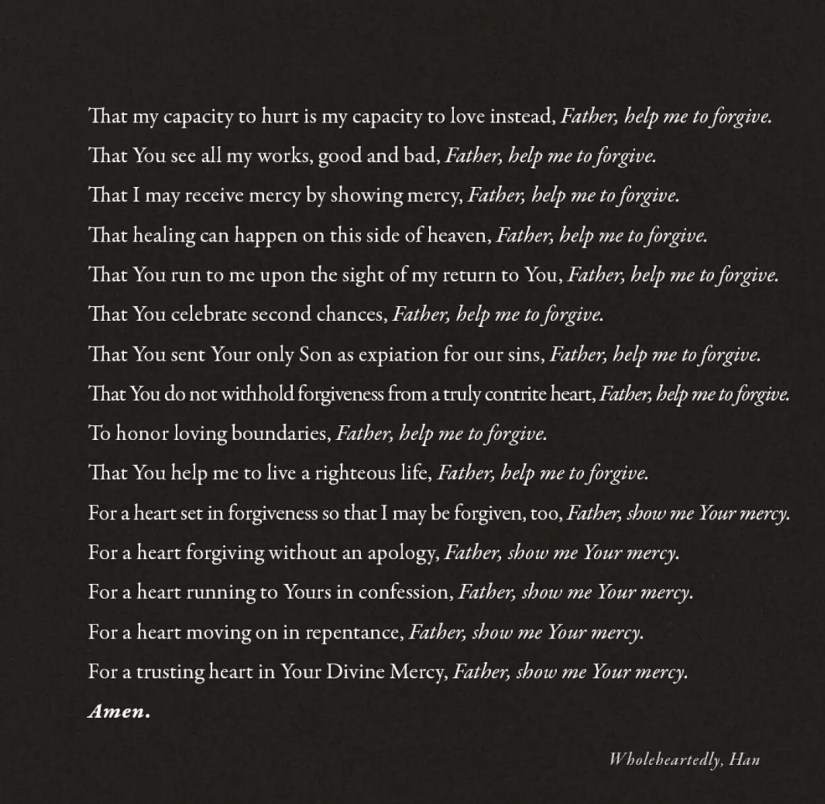 Today, I will chew on this Litany of Forgiveness and invite the Holy Spirit to heal my hostile emotions.