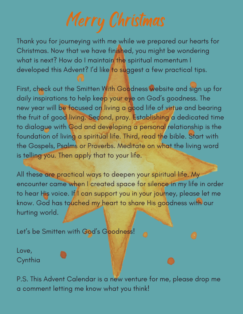 Lord, Jesus, Eternal Word of the Father, I thank You for coming among us and for making Your eternal dwelling present to us. Thank You for the great mystery of Christmas. Help me to always celebrate this season with great joy and gratitude, and also with a sense of mystery. May I always realize that the mystery of Christmas will never be fully understood. May this mystery draw me closer each and every day so that I may fall more deeply in love with You, my eternal God. Jesus, I trust in You.