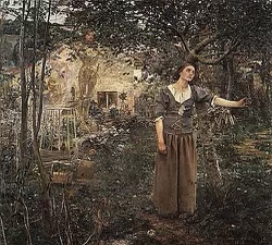 In the beautiful and haunting painting by Jules Bastien-Lepage that hangs in the Metropolitan Museum of Art, St. Joan of Arc is shown as a young woman in the garden of her home, with the transparent figures of St. Michael the Archangel, St. Margaret, and St. Catherine hovering above her. It is believed that this painting depicts the first time that St. Joan of Arc heard the call to arms to save France (when she was about 13 years old).