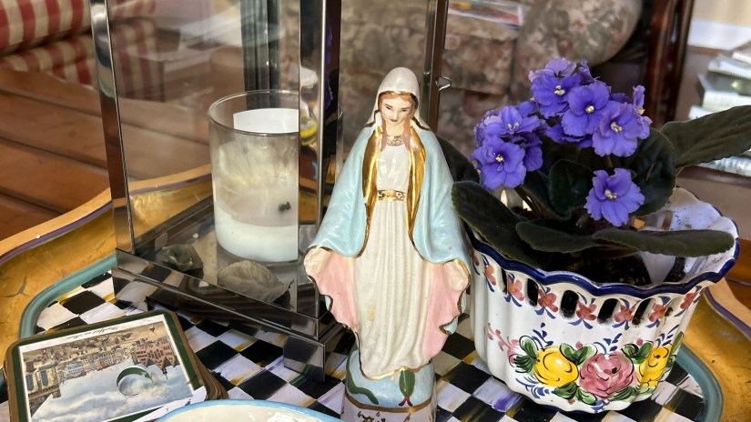 While I was shopping for them, I saw the most beautiful violet. It reminded me of my grandmother who tended and cared for the many violets she had. She would enlist me at times to water them all, despite my brown thumb. Despite my fear of killing this beautiful flower, I bought it and have been caring for it. This violet has brought me such joy just sitting on my coffee table in front of my comfy prayer chair. Not only is it beautiful, it reminds me of my grandmother who touched my life in a special way. The memories I recall each time I see the violet are like a prayer, calling me towards gratitude for this loving, steady, strong, kind woman in my life.