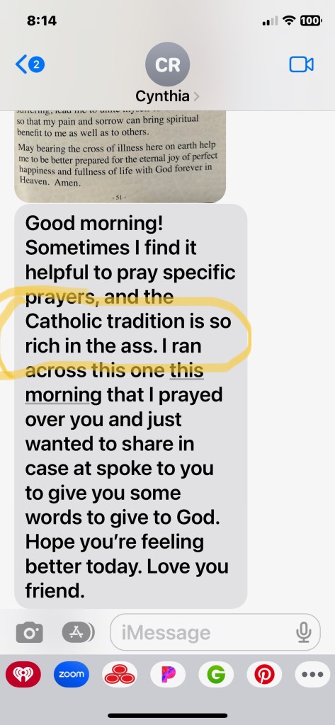 It was a prayer in time of personal illness by St. Padre Pio. Along with the prayer, I dictated some words of encouragement and hit send, not reviewing the text I had dictated.